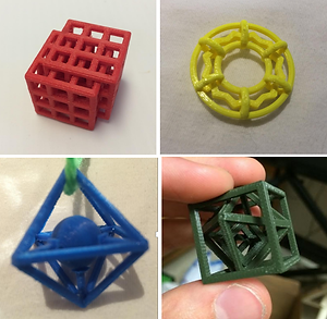 This cube rapidly unfolds and assembles when released due to gravity. It is printed entirely as one piece; it was interesting designing hinges and sliding parts that could be printed already assembled. Though the parts don't align perfectly, the design could be modified so they do. This idea could be used to make more intricate objects like collapsible furniture or tents.